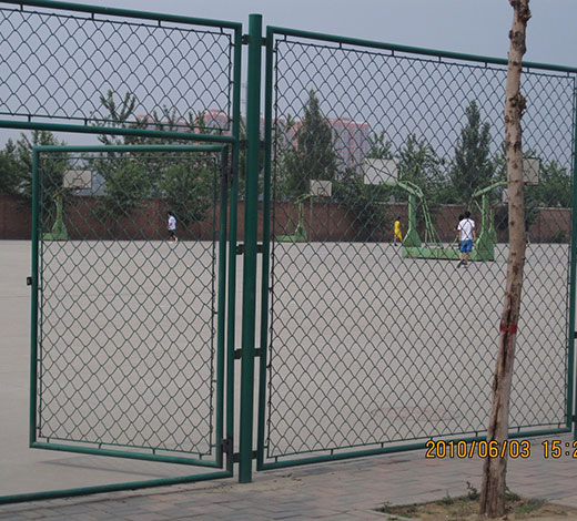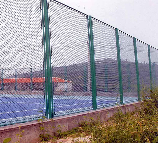 采用φ3.8鍍鋅線包塑網(wǎng),網(wǎng)孔規(guī)格45MM×45MM,網(wǎng)高4 M,立柱用φ75鋼管,橫柱用φ60鋼管刷二遍防銹專用底漆,二遍墨綠色面漆,包塑網(wǎng)用包塑扁鐵壓緊,用鍍鉻螺絲固定于網(wǎng)架上,做一扇1200×2000MM單門。在基礎(chǔ)施工時,按照預埋件施工示意圖所標明的尺寸,要先預埋好預埋件。挖500*500的地槽,燈柱預埋件的尺寸為300*300mm,圍網(wǎng)預埋件的尺寸為 250*250mm。每個預埋件用4個12mm的鋼筋焊接固定,鋼筋的長度為400mm。鋼筋在端部彎起。 圍網(wǎng)由包塑網(wǎng)、立柱、橫桿以及連接構(gòu)件組成。網(wǎng)高4米,所以在圍網(wǎng)中間設(shè)立一跟橫桿,用φ75鋼管,主要增強圍網(wǎng)的受力。圍網(wǎng)立桿的間距由球場四周范圍的尺寸決定,一般間距不超過3.8米。也不能太小,否則增加成本。