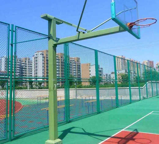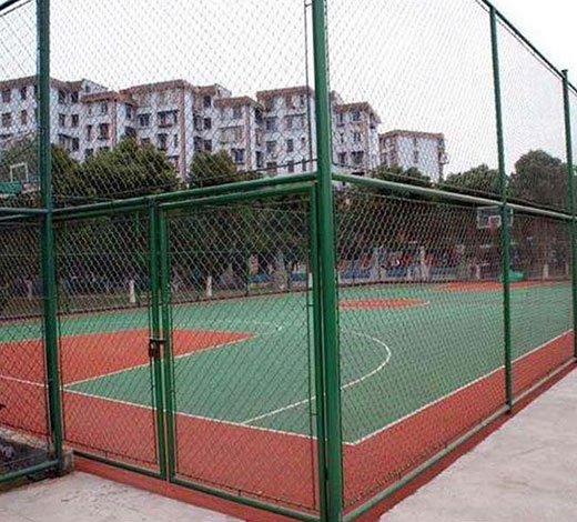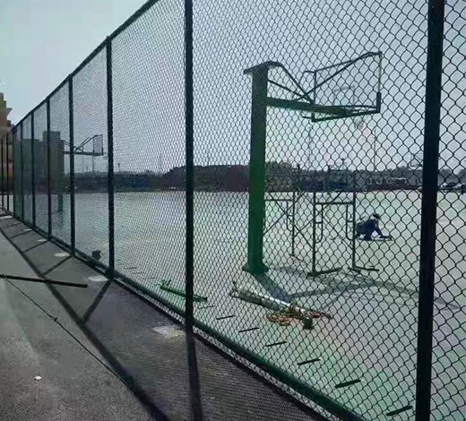 采用φ3.8鍍鋅線包塑網,網孔規格45MM×45MM,網高4 M,立柱用φ75鋼管,橫柱用φ60鋼管刷二遍防銹專用底漆,二遍墨綠色面漆,包塑網用包塑扁鐵壓緊,用鍍鉻螺絲固定于網架上,做一扇1200×2000MM單門。在基礎施工時,按照預埋件施工示意圖所標明的尺寸,要先預埋好預埋件。挖500*500的地槽,燈柱預埋件的尺寸為300*300mm,圍網預埋件的尺寸為 250*250mm。每個預埋件用4個12mm的鋼筋焊接固定,鋼筋的長度為400mm。鋼筋在端部彎起。 圍網由包塑網、立柱、橫桿以及連接構件組成。網高4米,所以在圍網中間設立一跟橫桿,用φ75鋼管,主要增強圍網的受力。圍網立桿的間距由球場四周范圍的尺寸決定,一般間距不超過3.8米。也不能太小,否則增加成本。